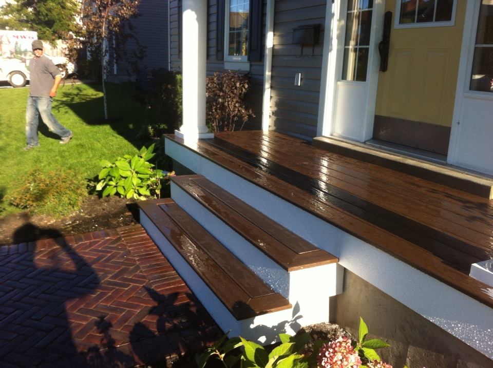 I wanted the look of a wooden clad front porch without the maintenance of wood so we went with a composite material from Veranda in Arabica color. The white skirting is also a composite or PVC standard product found in the lumber section. The stone steps are Owen Sound stone I believe...